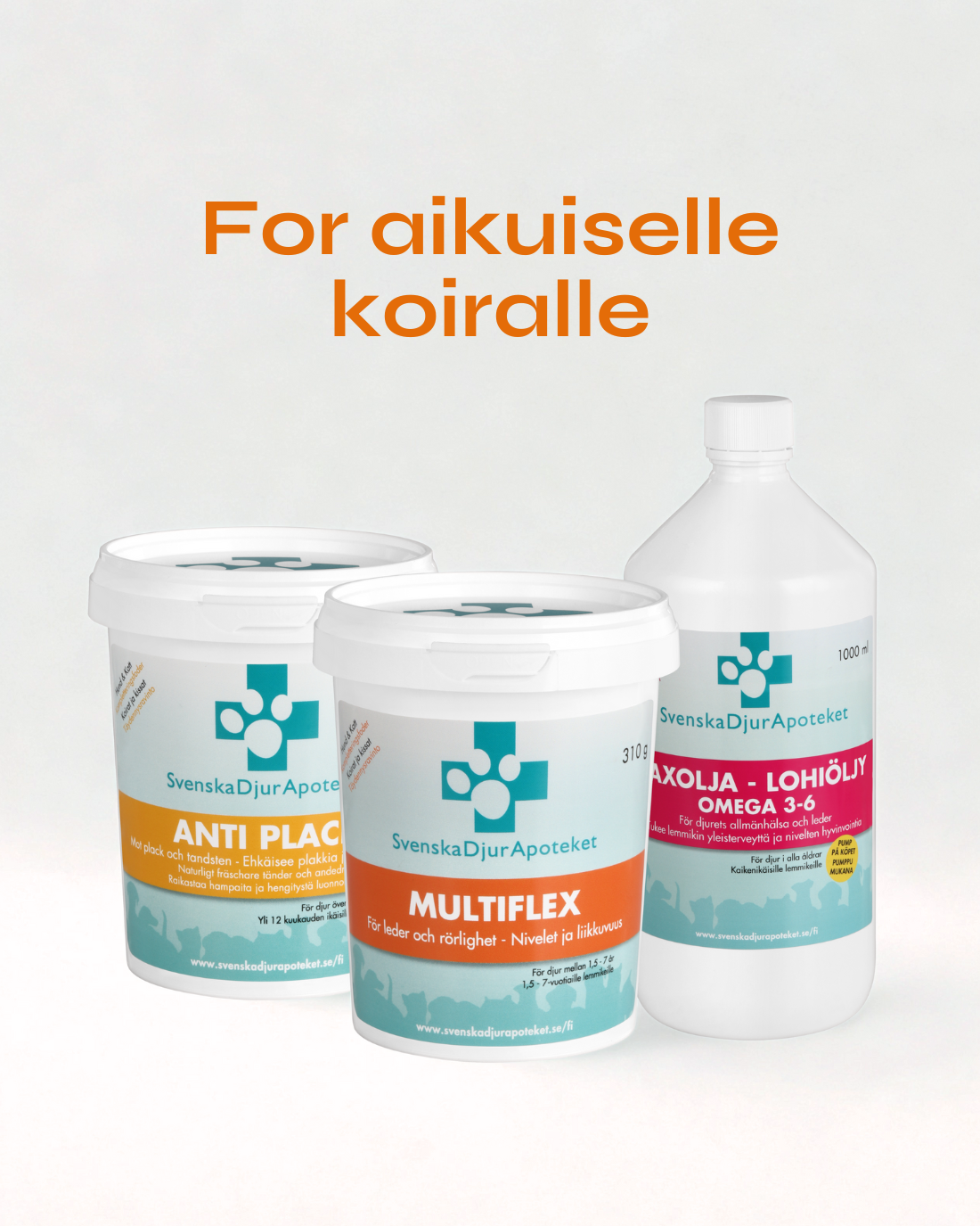 Valitse Lohiöljy 1 litra tai Omega-3 - Edistää ihon, kynsien, turkin ja sydän- ja verisuoniterveyden terveyttä. Monet koirat pitävät Lohiöljyn mausta.MultiFlex Powder 310g tai 200 tablettia - Edistää niveliä, rustoa ja liikkuvuutta.Anti Plaque - Edistää suun terveyttä ja ehkäisee pahanhajuista hengitystä, plakkia ja kiviä.