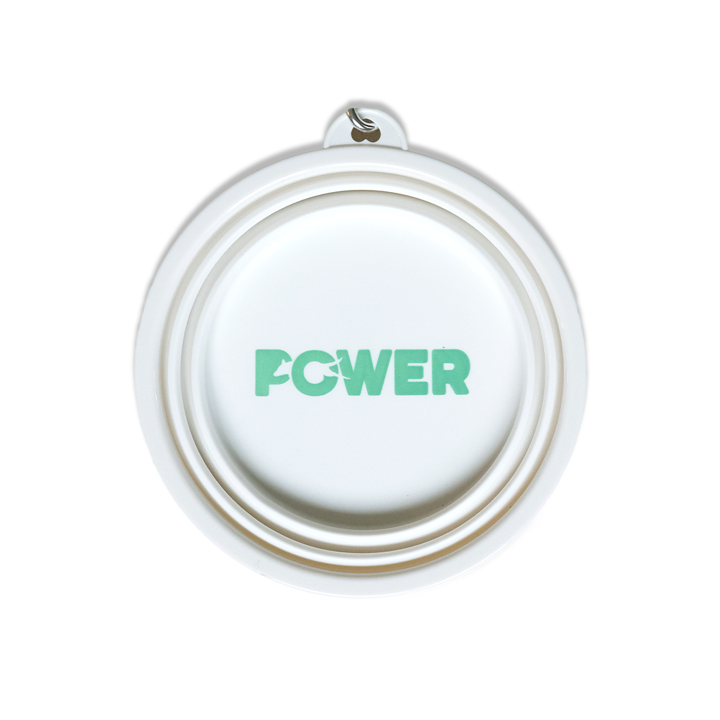 Kokoontaitettava POWER-kulho ruoalle tai vedelle käytännöllisellä koukulla, täydellinen autoon, harjoitteluun, matkoille tai pitkille kävelylenkeille.  POWER-logo kulhon pohjassa.