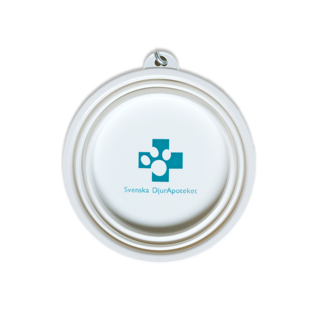 Swedish Animal Pharmacy kokoontaitettava kulho ruoalle tai vedelle, jossa on käytännöllinen koukku, täydellinen autoon, harjoitteluun, matkoille tai pitkille kävelylenkeille. Swedish Animal Pharmacy -logo kulhon pohjassa.